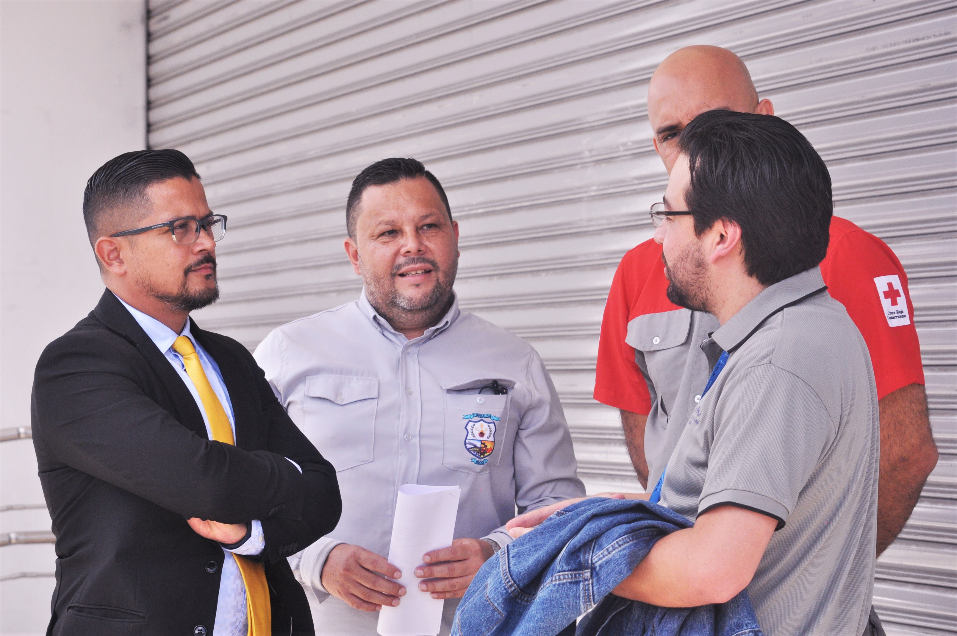 El alcalde Carlos Hidalgo, junto al encargado de Gestión de Riesgo de la Municipalidad, Luis Estrada, el meteorólogo del IMN, Juan Diego Naranjo, y el director de gestión de riesgos de la Cruz Roja, José Zúñiga